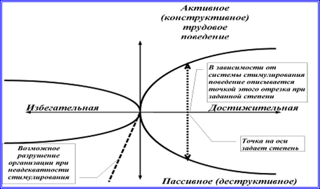 Если же стимулирующее воздействие неадекватно, то поведение человека становится пассивным или деструктивным. Это отражается точками, лежащими ниже горизонтальной оси. При предельно неадекватной системе стимулирования поведение становится предельно деструктивным, соответствующая точка лежит на кривой в нижней части рисунка.