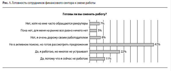 Тем ни менее работодатели обеспокоены возможностью увольнения сотрудников по собственному желанию. Но готовы ли сами сотрудники менять место работы? Результаты опроса на эту тему представлены на рис. 1.