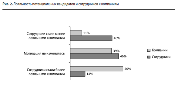 Также исследование показывает, что результатом всех рыночных и корпоративных изменений, происходивших в 2009 г., стало снижение лояльности потенциальных кандидатов и сотрудников к компаниям (рис. 2).