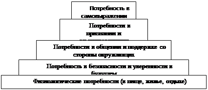 В соответствии с теорией иерархии потребностей американского социолога А. Маслоу люди постоянно испытывают различные потребности, которые можно объединить в группы, находящиеся в иерархическом отношении друг к другу. А. Маслоу выделил пять таких групп и расположил их в виде пирамиды (Рис. 1).