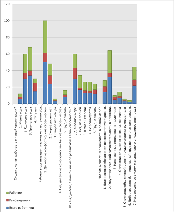 Таким образом, анализируя таблицу 2.1 ( рисунок 2.1 соответственно), можно сказать о том, что большинство работников предприятия (30 человек или 35,29%) работают здесь уже более года. Причем большая часть руководителей (10 человек или 40%) не покидает место работы уже на протяжении пяти лет.