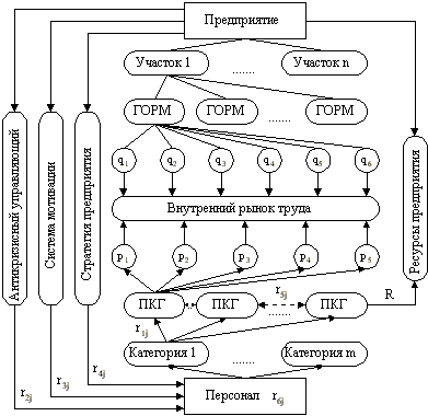 Модель менеджмента персонала предприятия (рис.1) предназначена для выявления соответствия характеристик профессионально-квалификационных групп (pj) требованиям групп однородных рабочих мест (qi) на внутреннем рынке труда предприятия. Сопоставление векторов требований (q1, .,q6) и характеристик структурных единиц персонала (p1, .,p5) позволяет выявить степень их согласованности.