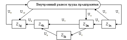 Управление соответствием характеристик pj требованиям qi осуществляется с помощью контура управления производительностью труда R, путем воздействия на соответствующие факторы rij. При этом происходит процесс формирования управленческих решений, направленных на оптимизацию внутреннего рынка предприятия через повышение качественно-профессиональных характеристик персонала. Приведение внутреннего рынка труда предприятия в балансовое состояние (соответствие pj — qi) влечет за собой качественный прорыв в производственной деятельности предприятия без изменения производственных технологий, а лишь за счет улучшения использования ресурсов. Данный подход можно рассматривать как одну из действенных оборонительных стратегий антикризисного управления предприятием, суть которой заключается не в привлечении ликвидных средств для внедрения новых технологий, вследствие глобального кризиса отечественной экономики, а в повышении качества использования существующих технологий и ресурсов.