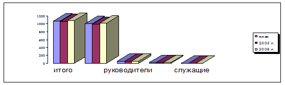 Как видно из табл. 5, фактическое количество работников по категориям в 2005 г. не соответствовало плановым данным – численность рабочих была ниже запланированной на 1004-991 = 13 человек (1,3%), по остальным категориям штат предприятия укомплектован полностью. В 2006 г. численность персонала по категории рабочих даже превысила плановые данные на 14 человек или на 1,4%. Численность всех остальных категорий работников в 2006 г. соответствовала данным плана. Представим полученные данные в виде диаграммы (рис. 2).