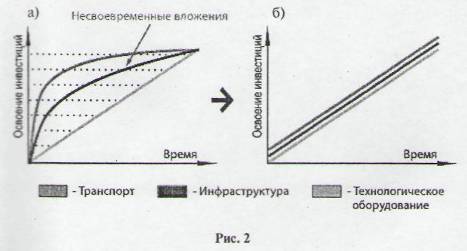 Внедрение для транспорта, инфраструктуры и технологического оборудования должно быть согласовано во времени и по объемам (рис.2 б). Несвоевременные вложения, что часто имеет место на практике, приводят к значительным потерям.