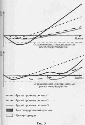 Важна также и оптимизация очередности реализации групп проектов по различным регионам (рис.3). Выбор рациональной стратегии может существенно уменьшить нагрузку на холдинг по внешнему финансированию.