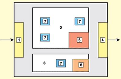 Рисунок 1. Места расположения складов производственного предприятия: 1 - склад сырья, материалов, полуфабрикатов и комплектующих общехозяйственного назначения. 2 - основное производство. 3 - вспомогательное производство. 4 - склад готовой продукции и полуфабрикатов собственного изготовления общехозяйственного назначения. 5 - склад общецехового назначения основного производства. 6 - склад общецехового назначения вспомогательного производства. 7 - склад на рабочем месте основного и вспомогательного производства.
